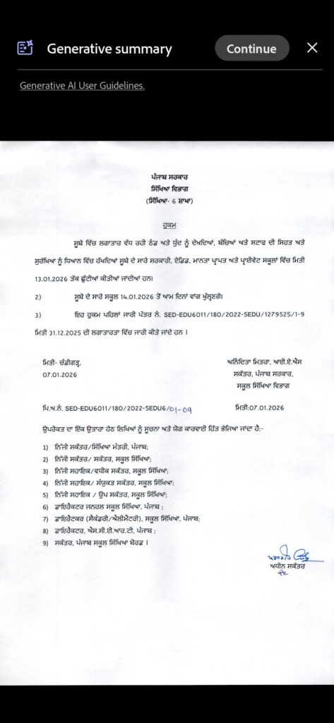 Holiday extend to 13.01.2026 January 7, 2026 | No Comments Join our WhatsApp Channel for latest updates https://whatsapp.com/channel/0029Va9WnVhCnA7xBdErUx1k Sharing is caring: Announcement, Department of School Education Punjab, Holiday, Service Matter Solutions Exclusive , education department, holi